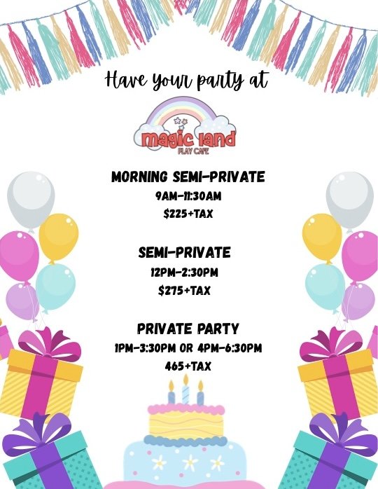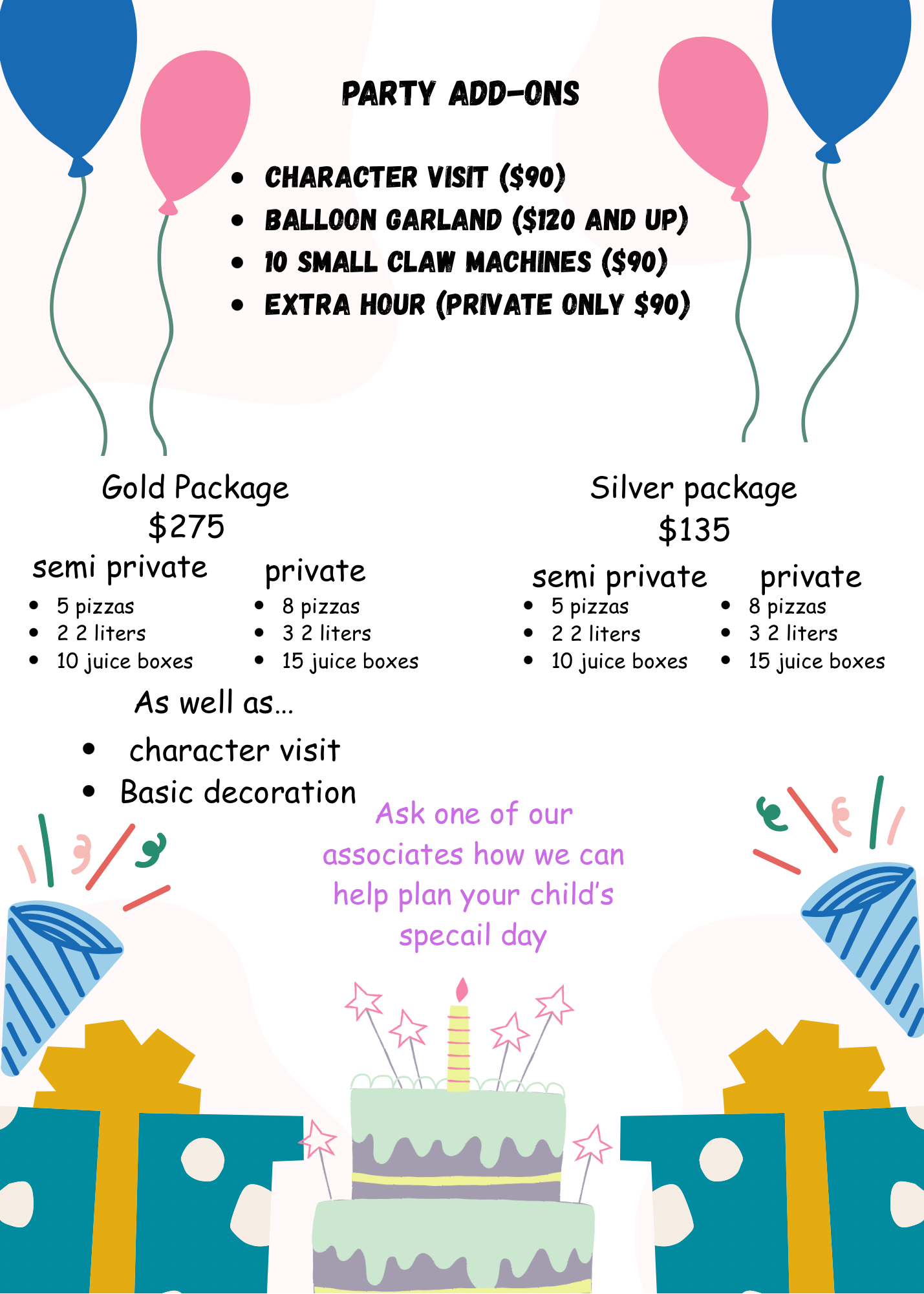 All parties are for 2.5 hours. We allow 15 minutes to set up and an additional 15 minutes to clean up. Outside food/drinks are permitted as well as outside decorations. All children attending a party must sign the waiver.